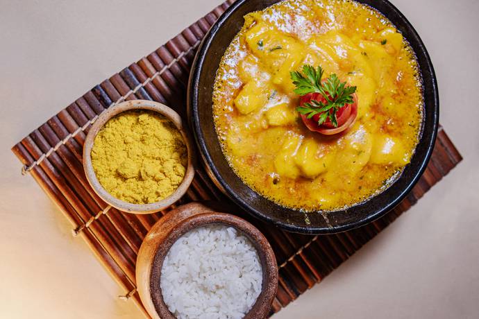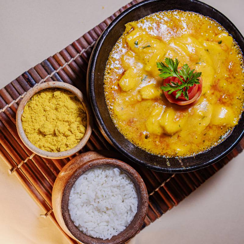 Preparado com epeciarias baianas, vietnamitas, Tailandesas e Chinesas, ao leite de coco e azeite de dendê, acompannha arroz e farofa.